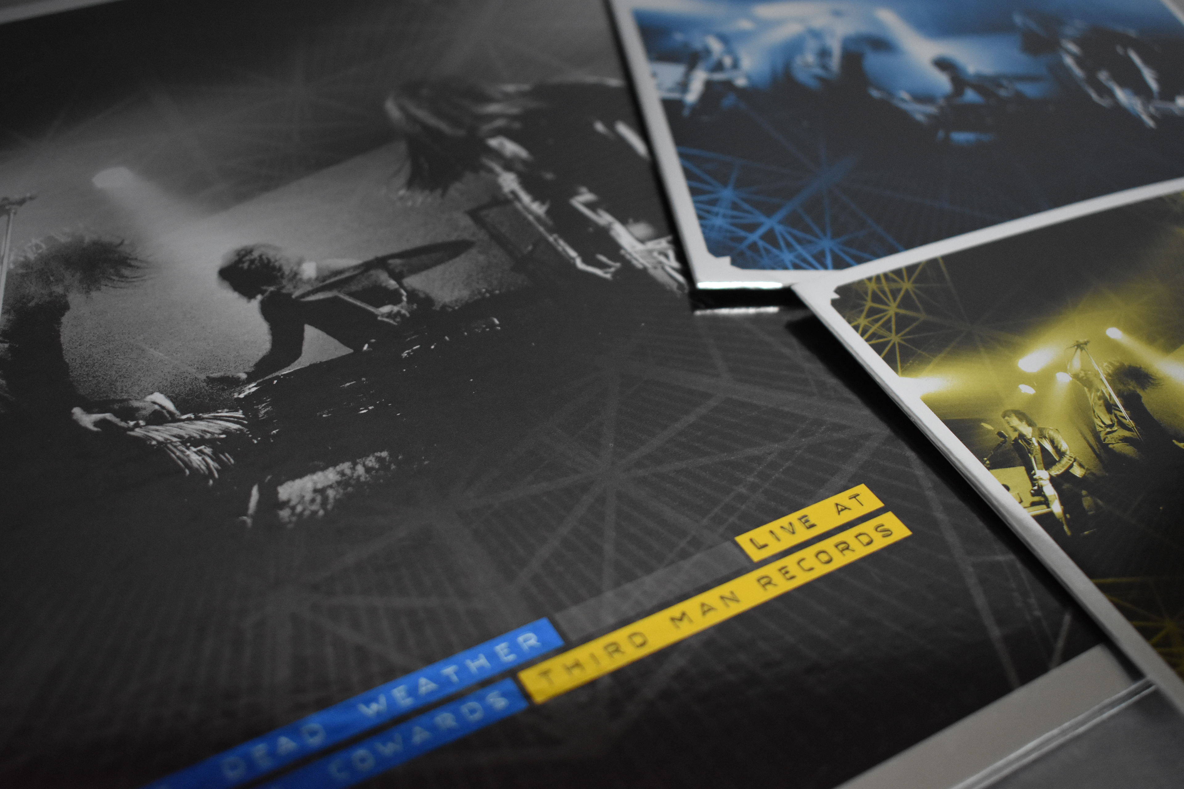 For the third Vault package we released a live recording of The Dead Weather's 'Sea of Cowards'. To promote the release of the regular LP The record was live streamed playing continuously on a turntable in the Third Man offices for 24 hours. This playback lead up to a midnight timed live performance of the LP from the Third Man Blue Room that was both live streamed and recorded direct to tape. The release came with a companion 7" along with DVD of the performance. All printed on mirror board, utilizing the work of Third Man resident photographer, Jo McCaughey. The joy of the third man experience was that given the small size of the label at it's start roles and responsibilities were fluid. Often the design role developed in to production and planning for larger events that we put on.